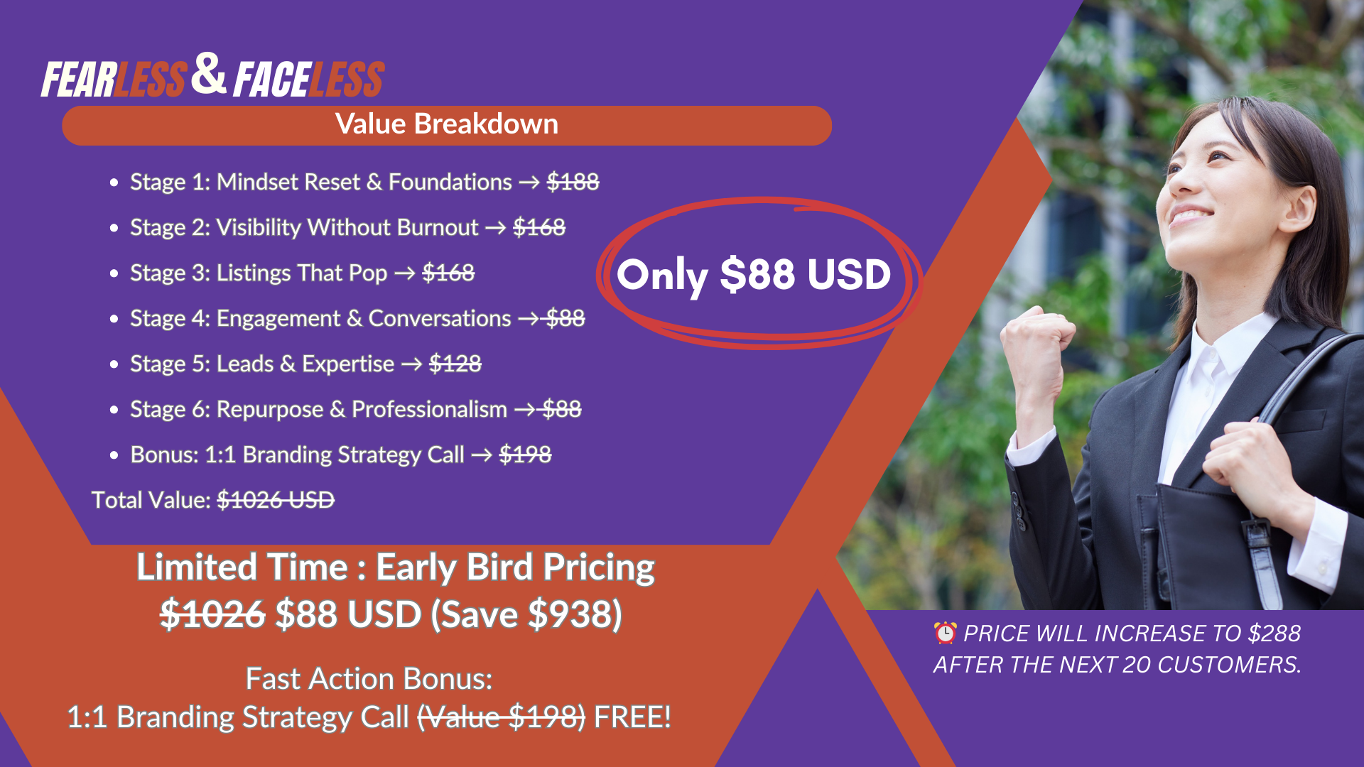 - đ Bonus: Free 1:1 Branding Strategy Call (Value: $198)