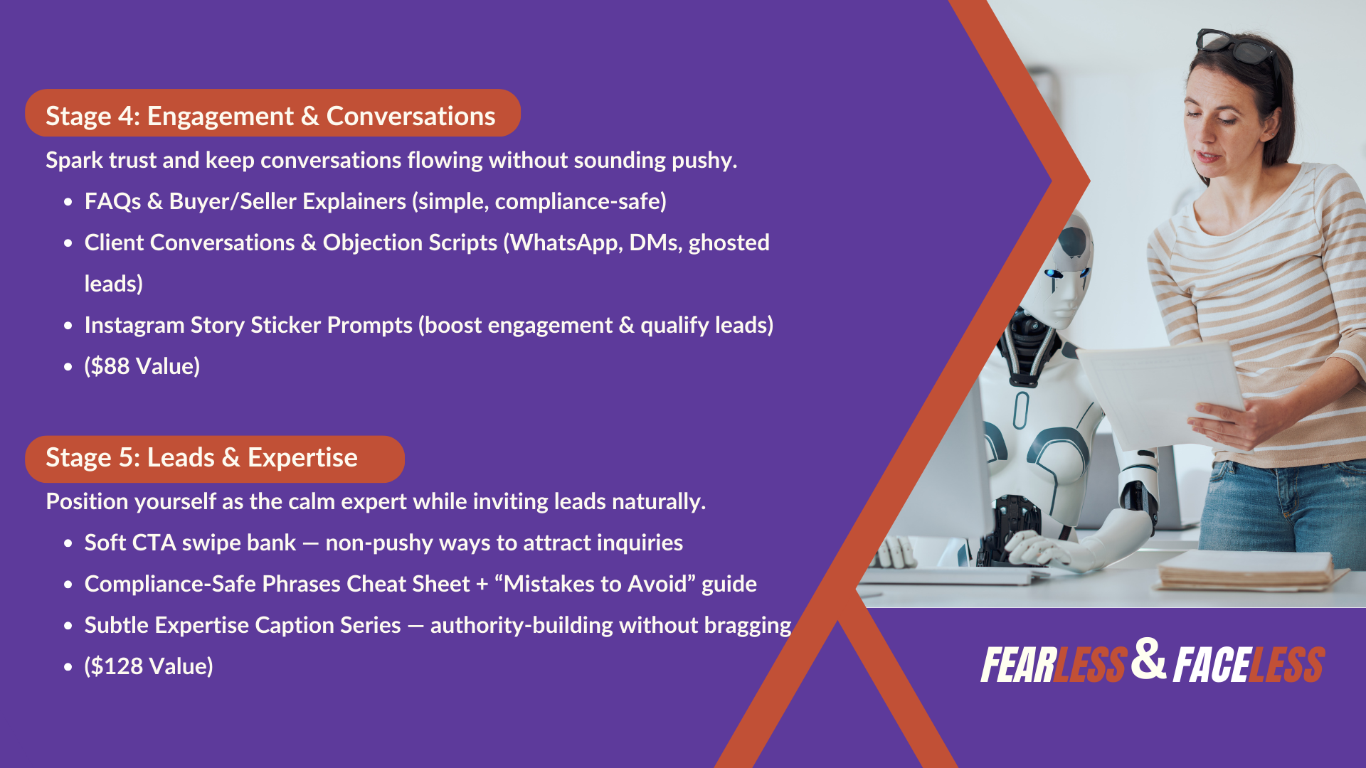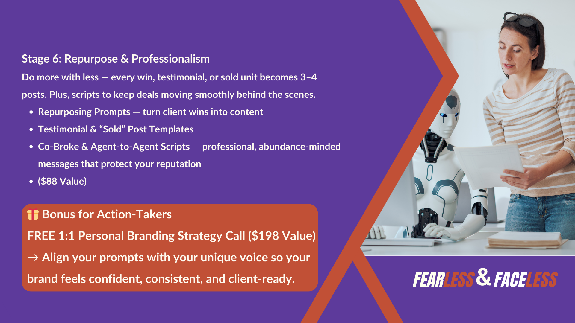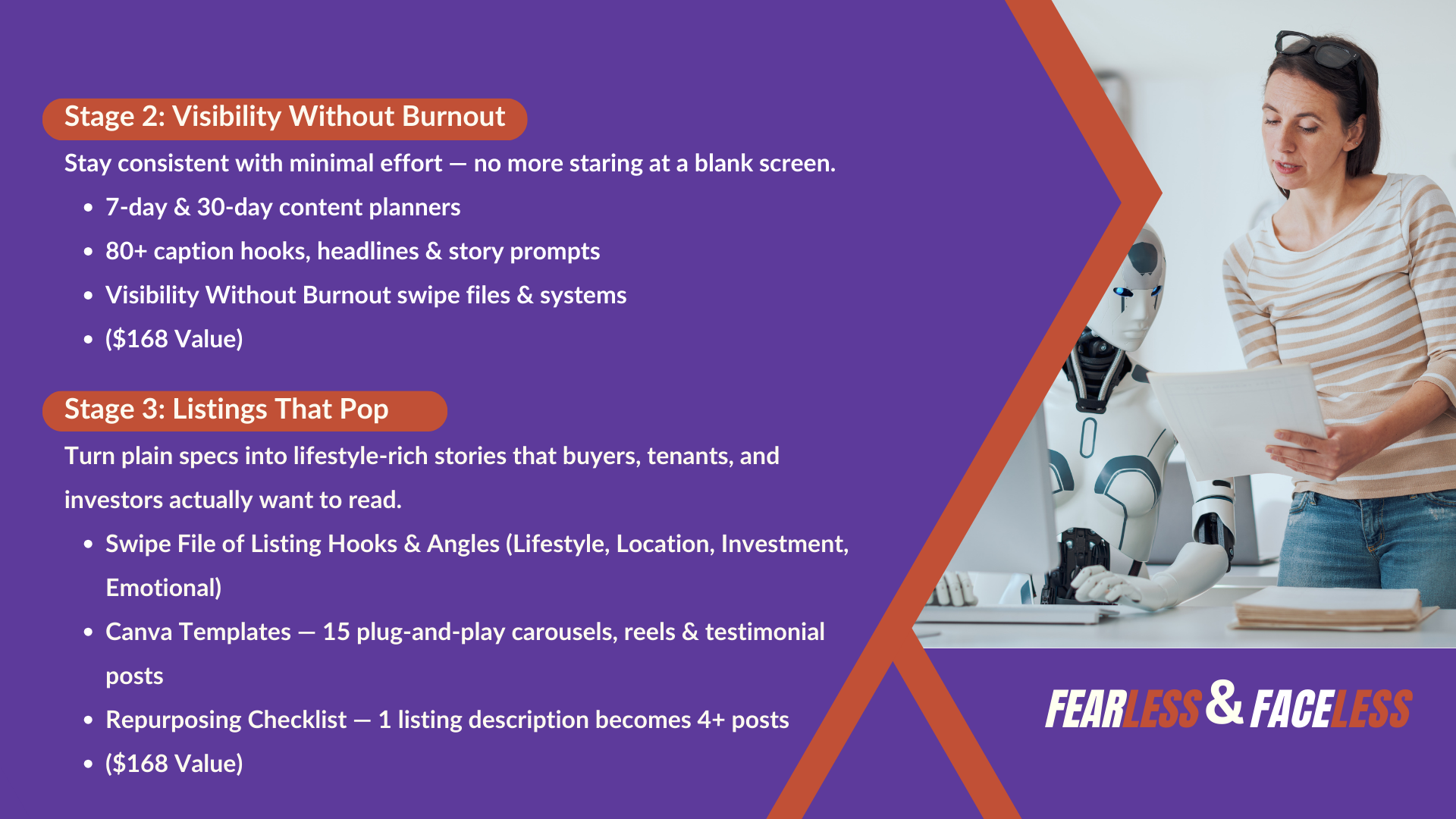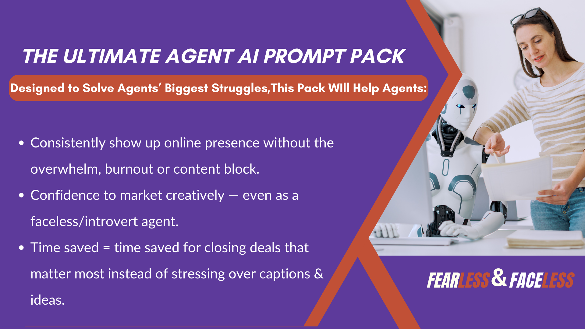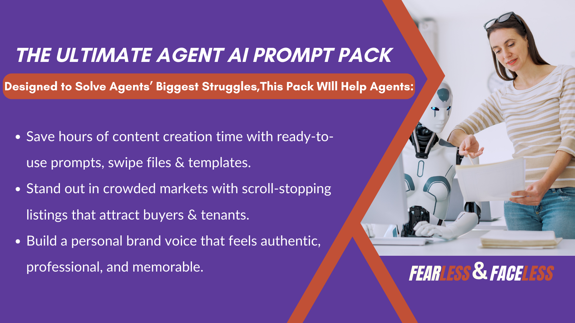 With fearessandfaceless, youâll use AI like your own personal branding and marketing team. Use prompts, templates and swipe files to create content that markets your listings boldly, build your personal brand creatively, and keep you consistently visible⌠stress-free, camera-free, and in your own authentic voice.