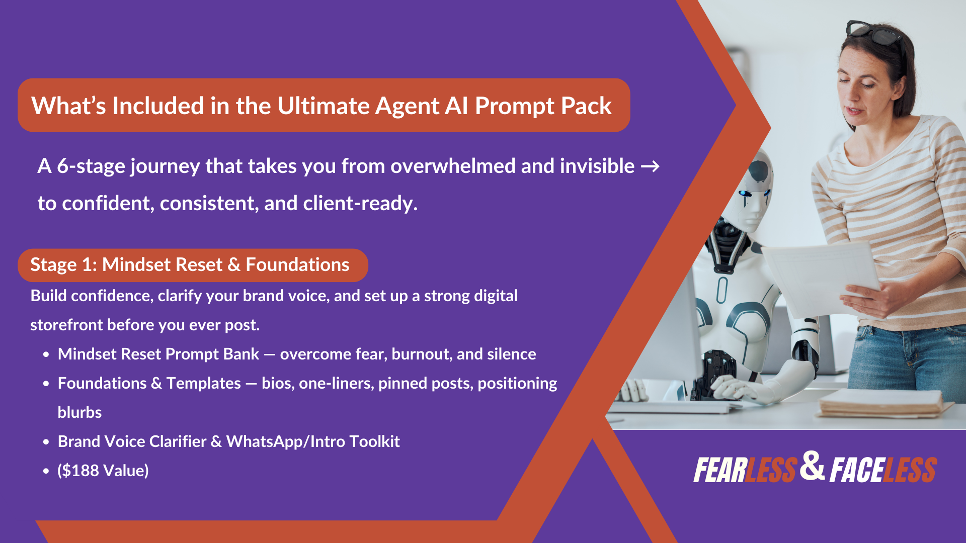 The Ultimate Agent AI Prompt Pack was built as a step-by-step journey â not just a list of prompts. With 128+ copy-and-paste prompts, Canva templates, and scripts, every stage takes you closer to confidence, visibility, and trust.