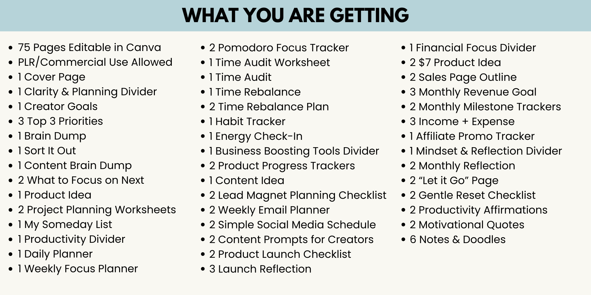 - ✔ Huge value — 75+ pages covering planning, productivity, finances, mindset, and content creation