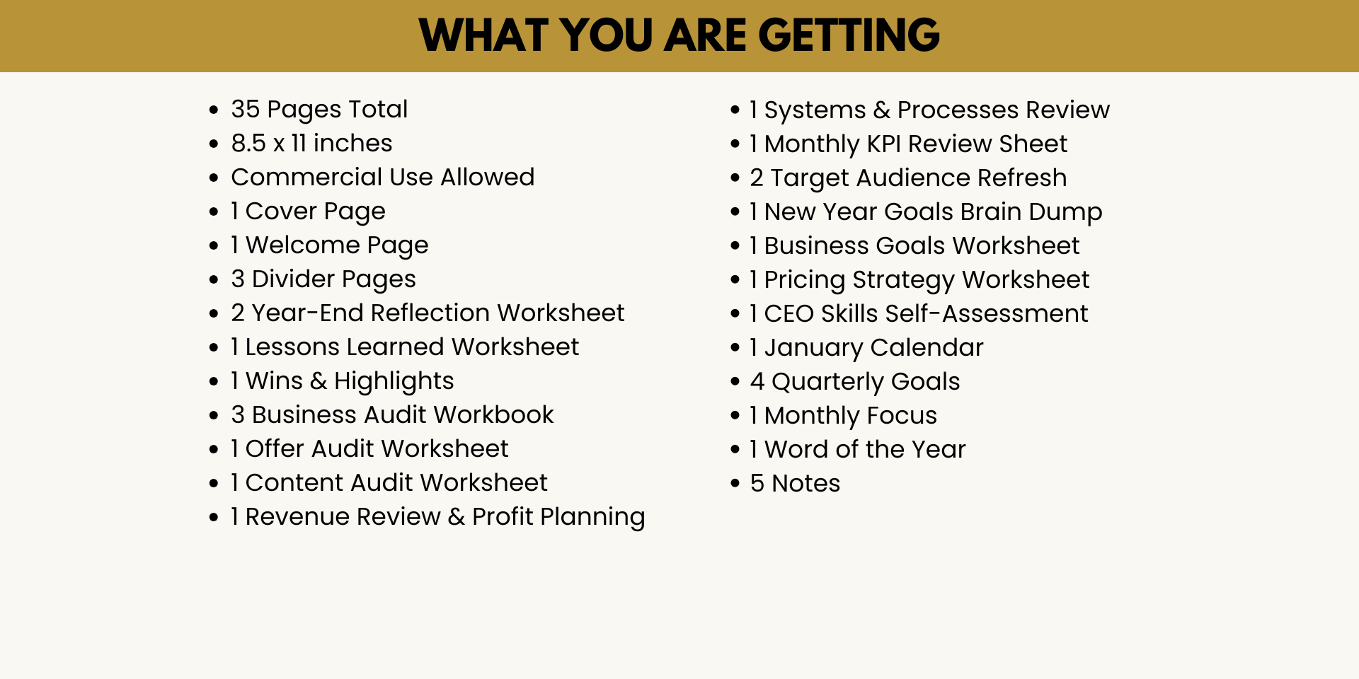 This ready-to-use workbook guides them through auditing their business, reviewing what worked, identifying what needs improvement, refreshing their goals, revisiting their pricing and offers, and planning for a more profitable, organized, and intentional year ahead.