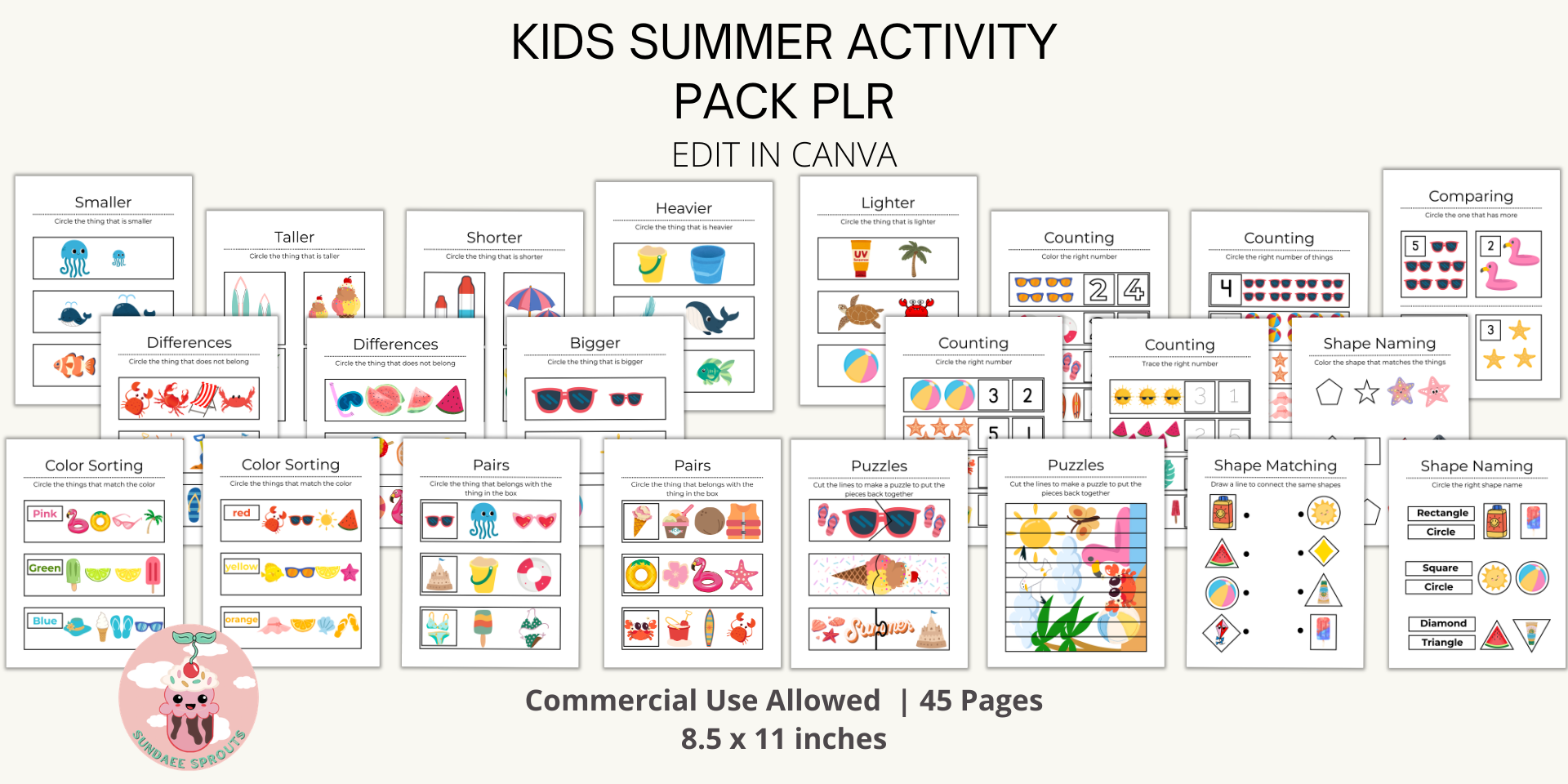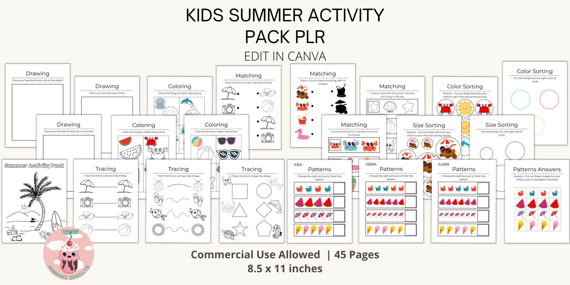 The Kids Summer Activity Pack PLR includes 45 fun and interactive pages designed to help children practice important early learning skills while enjoying summer-themed activities. From tracing and coloring to matching, counting, sorting, and puzzles, this pack is filled with playful exercises that keep young learners engaged.
