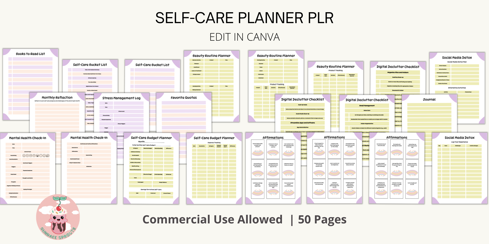 🌸 Self-Care Planner PLR – 50-Page Editable Canva Template (Commercial Use)