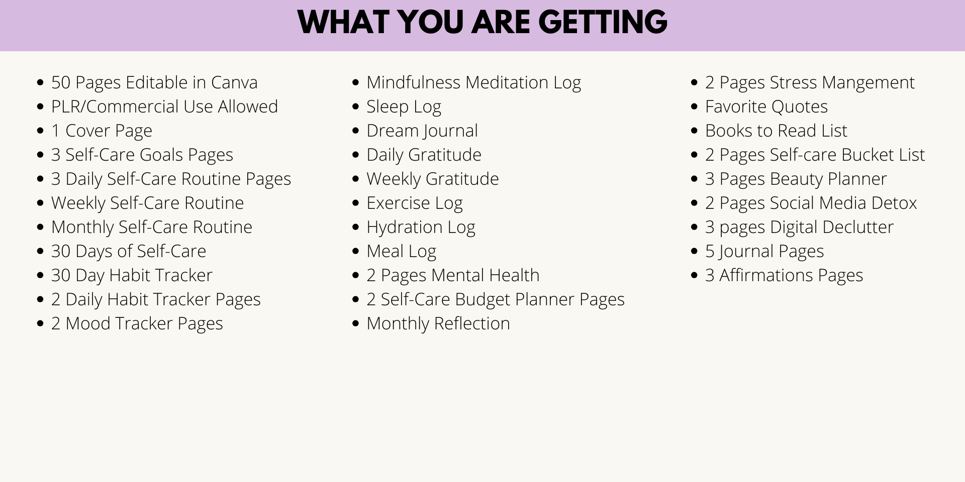 Help your audience simplify their self-care routine with this colorful and fully editable 50-Page Self-Care Planner PLR. This planner is designed for easy customization, making it perfect for selling as your own product, adding to memberships, or offering as a bonus in your wellness or lifestyle programs.