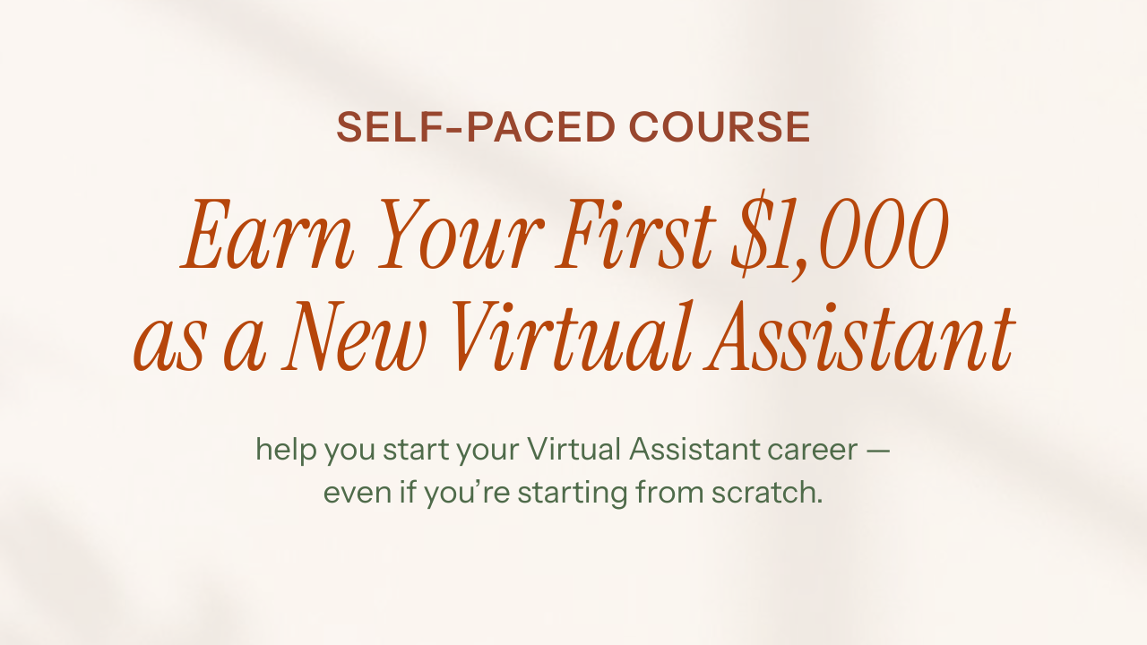 In just a few bite-sized lessons, you’ll go from feeling lost and overwhelmed... to having your first real roadmap to land your first $1,000 as a Virtual Assistant.